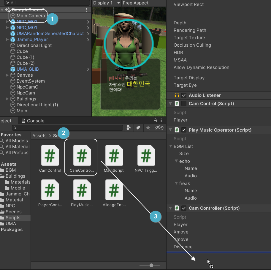 ( 마우스를 떼는 순간 Inspector 창에는 카메라의 속성이 아닌 Jammo Player 오브젝트의 속성으로 바뀌어 버리기 때문입니다. 혹여라도 바뀐 경우라도, 다시 Main Camera 를 선택후 진행해주시면 됩니다. )