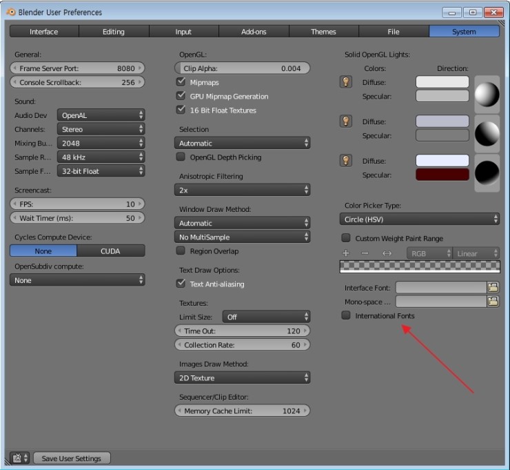 창 크기를 아래쪽으로 늘려주신 다음, International Fonts ( 빨간 화살표 ) 를 체크해주세요