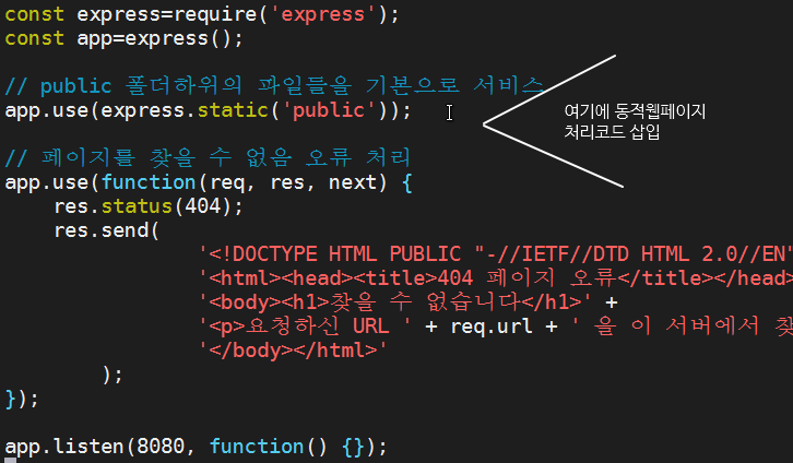 app.get() 함수를 사용하면 되는데요. 정적웹페이지 사용을 선언한 부분과 오류 처리 코드 사이에 배치해 주시면 됩니다.