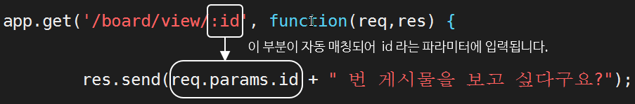 이때 패턴 매치되는 값을 :id 라고 정해주면 내부에서는 req.params.id 라는 이름으로 사용할 수 있습니다.