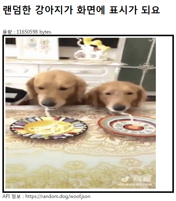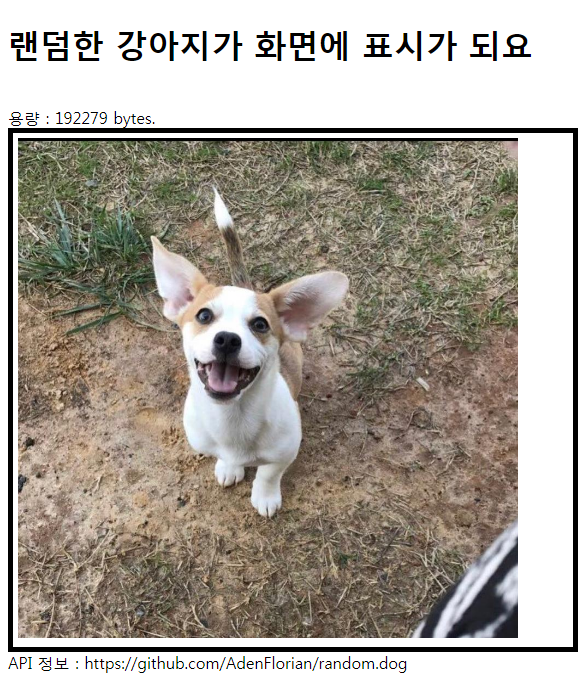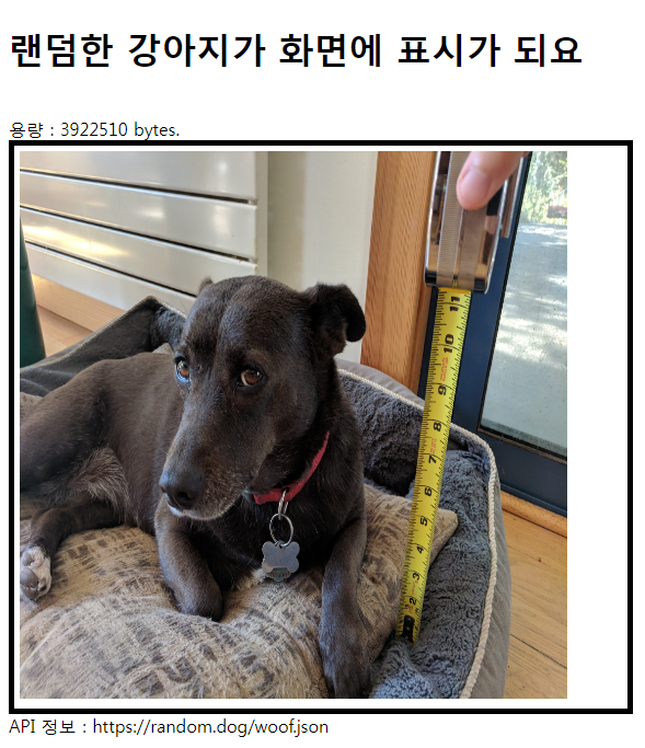 그래서 최종적으로 템플릿 문서를 완성하고 아래와 같은 랜덤한 강아지 이미지와 함께 이미지 파일의 용량이 표시가 되는 것이지요.