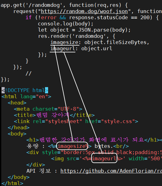 우선 이 예제에서 템플릿 문서는 아래와 같은데요. views 폴더에 있는 randomdog.ejs 파일입니다.