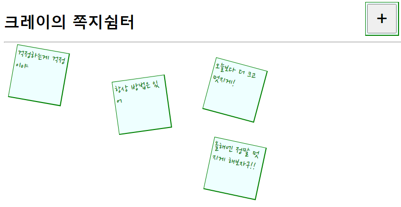 + 버튼을 눌러 쪽지를 추가하면 랜덤한 위치에 쪽지가 추가되는 것이지요.