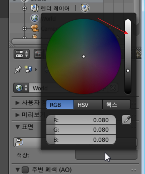 오른쪽이 밝기 부분인데요. 밝은 색으로 바꾸기 위해서 마우스로 빨간 화살표가 가르키는 부분을 클릭해주세요.