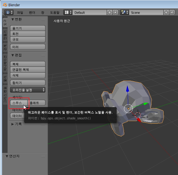 - 오브젝트 표면을 부드럽게 하려면 '스무스'버튼을 눌러주면 됩니다.