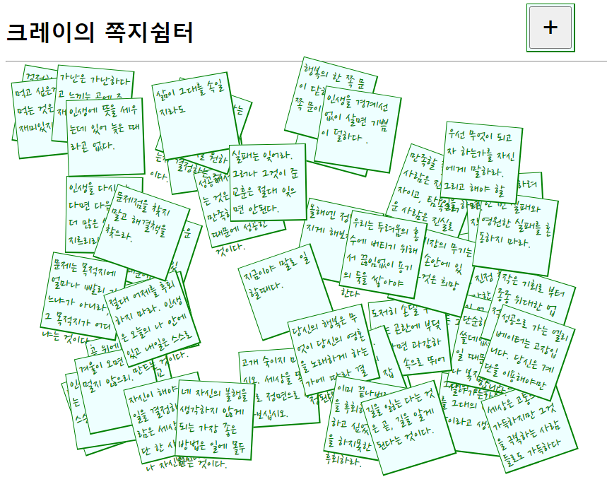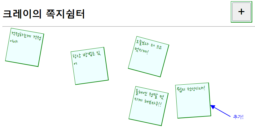 쪽지 내용을 입력하고 확인 버튼을 누르면, 바로 화면에 쪽지가 추가됩니다.
