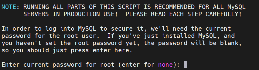 이어서 MYSQL 서버의 root 패스워드를 입력할 것인지를 묻습니다. y 입력 후 Enter 키를 타이핑합니다.