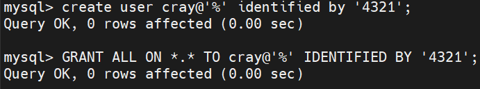GRANT ALL ON *.* TO cray@'%' IDENTIFIED BY '비번';