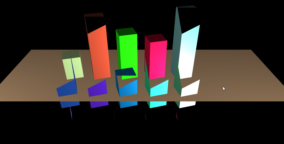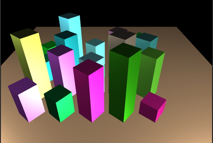 그리고 실행해보시면 3차원 막대 그래프가 랜덤하게 산발하듯이 솟아오르고 천천히 회전하는 것을 보실 수 있을 겁니다.