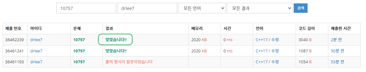 이를 백준에 돌려보면 결과는 아래와 같이 무사 통과!