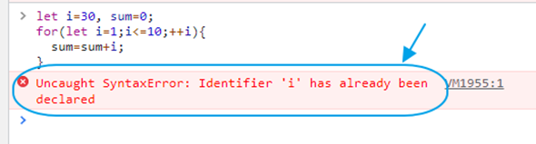 콘솔창에서 바로 빨간 글씨의 오류가 표시되거든요. i라는 변수가 이미(already) 선언되었다는 의미입니다.