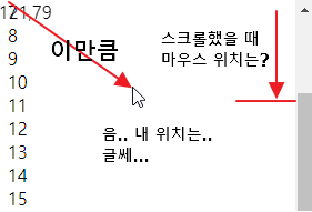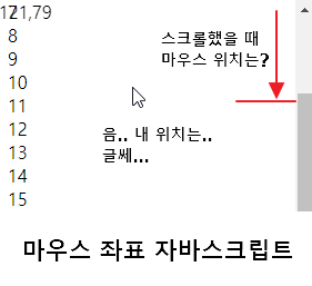 자바스크립트에서는 현재 사용하는 웹브라우저 화면의 마우스 위치를 알 수가 있습니다.