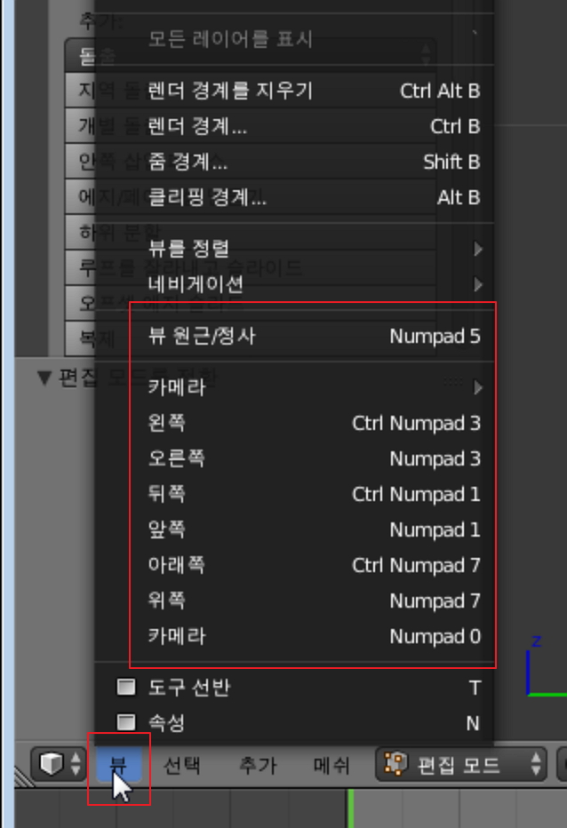 이런 식으로 숫자키패드의 키를 이용하여 뷰포트를 빠르게 전환할 수 있습니다.