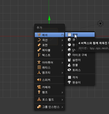 이제 Shift+A 단축키 > 메쉬 > 평면을 선택해서 바닥을 만들어볼까요?