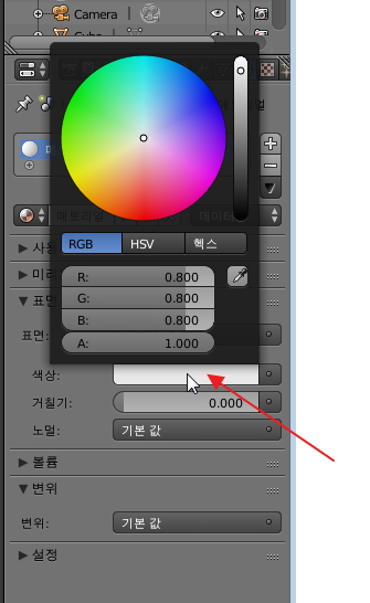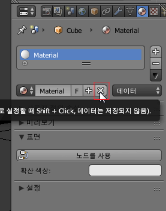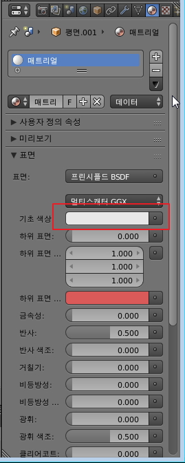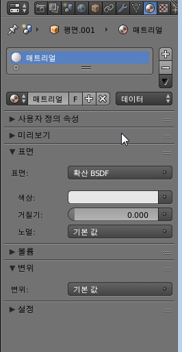 오른쪽 메트리얼 창에서 '표면' 선택이 '확산 BSDF'로 되어 있을 겁니다.