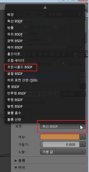 클릭해서 '프린스폴드 BSDF'로 바꿔주세요.