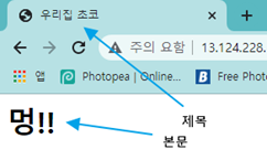 | <html> <head> <title>우리집 초코</title> </head> <body> <h1>멍!!</h1> </body> </html> |