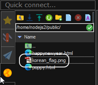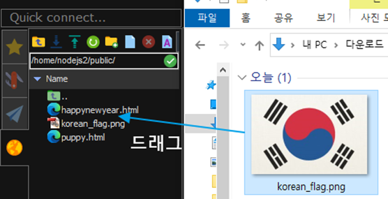 그리고 방금 다운로드한 태극기 이미지 파일을 SSH Browser 의 탐색창에 드래그 합니다.