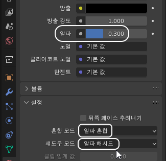 나머지 알파값/0.3 - 혼합모드/알파 혼합 - 새도우 모드/알파 해시드 선택하신 다음에,