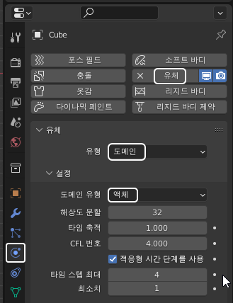 도메인 오브젝트를 선택, 유형/도메인 - 도메인 유형/액체를 선택합니다.