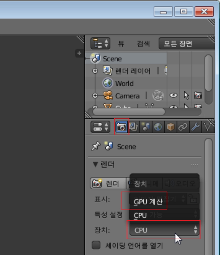 블렌더를 시작하고 제일 먼저 고성능 렌더러인 사이클 렌더를 선택해 주세요.