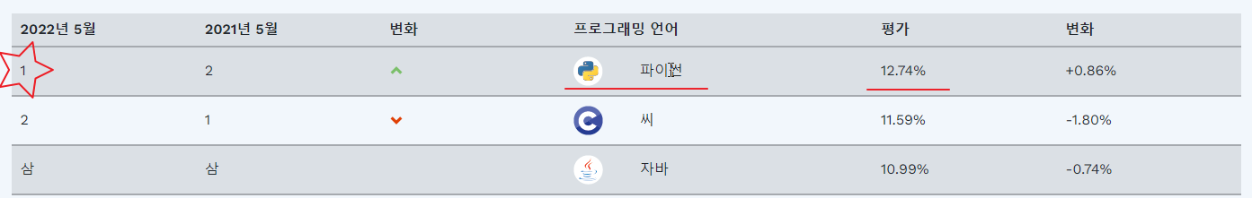 2021년 5월까지 C 언어가 1위였지만, 2022년 5월에는 파이썬이 역전을 하여 당당히 1위를 차지하였습니다.