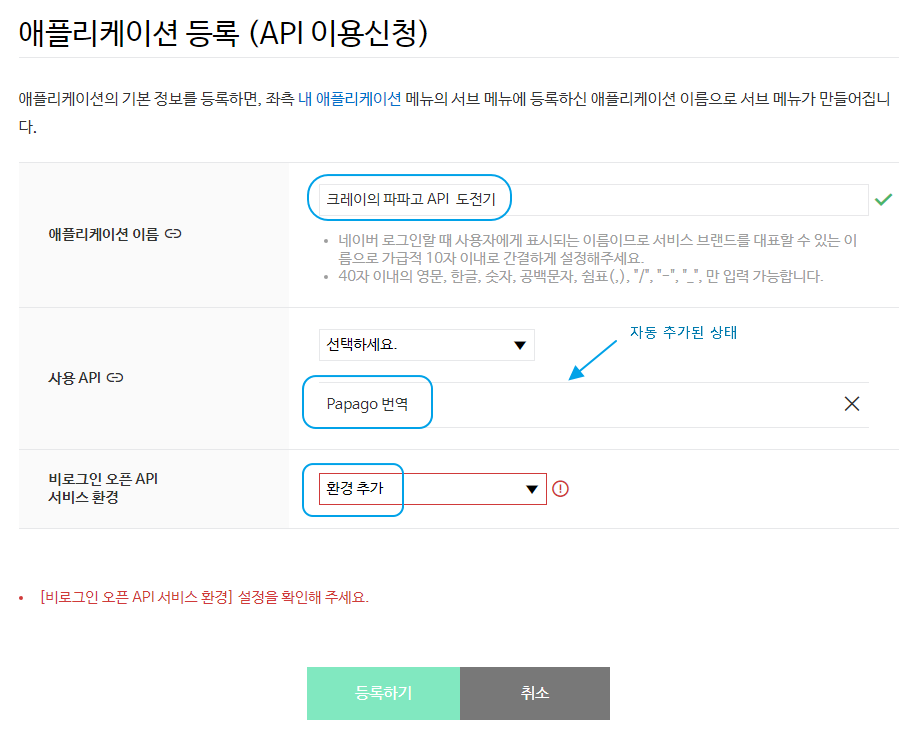 사용 API 부분에는 Papago 번역이 자동 선택되어 있을테니 손대지 않아도 됩니다.