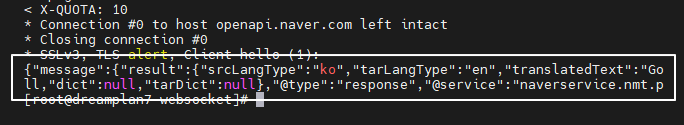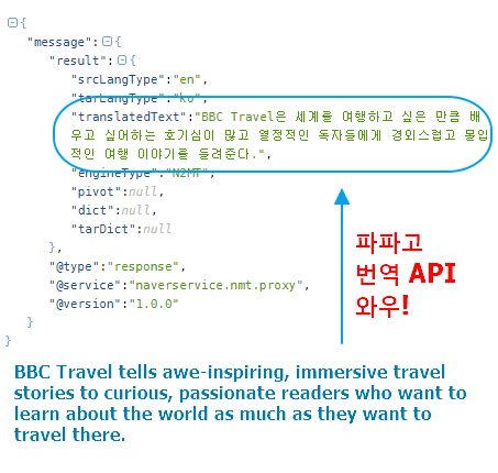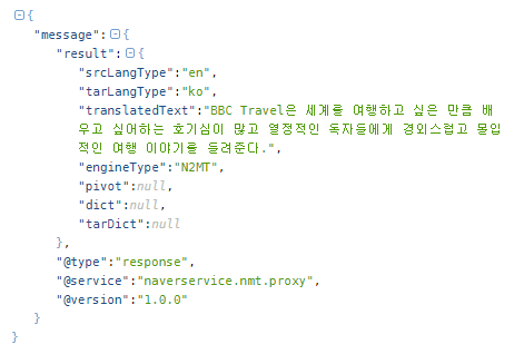 이 중 아래 부분이 파파고 API의 결과물입니다. 보통 이런 형태를 JSON 이라고 하는데요.