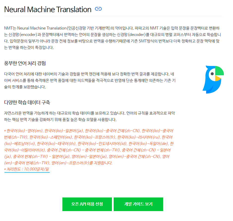 파파고 API는 하루에 10,000글자까지만 번역에 활용할 수 있습니다.