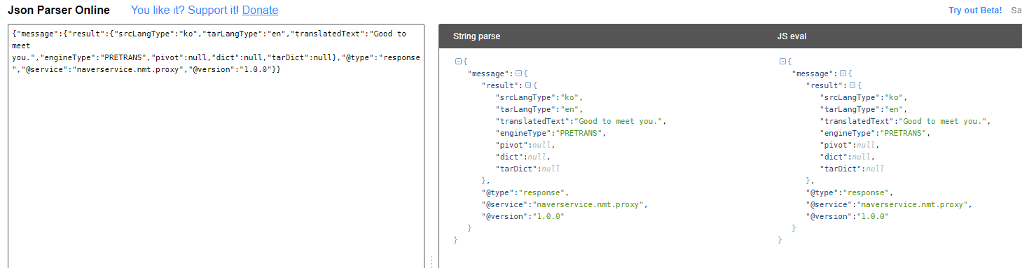 이 결과 부분을 크레이가 자주 애용하는 JSON 파서라는 홈페이지에 접속,