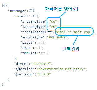 {"message":{"result":{"srcLangType":"ko","tarLangType":"en","translatedText":"Good to meet you.","engineType":"PRETRANS","pivot":null,"dict":null,"tarDict":null},"@type":"response","@service":"naverservice.nmt.proxy","@version":"1.0.0"}}