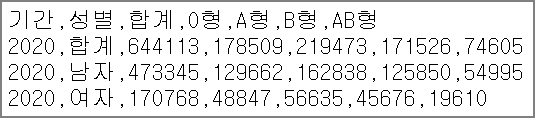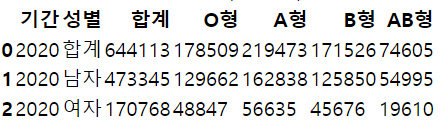 이 내용은 실제 2020년 혈액형별 헌혈 인구입니다.
