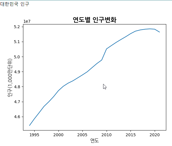 출력결과는 아래와 같습니다. ''연도별 인구변화'와 연도, 인구 부분이 한글로 나타나는 것을 보실 수 있지요.