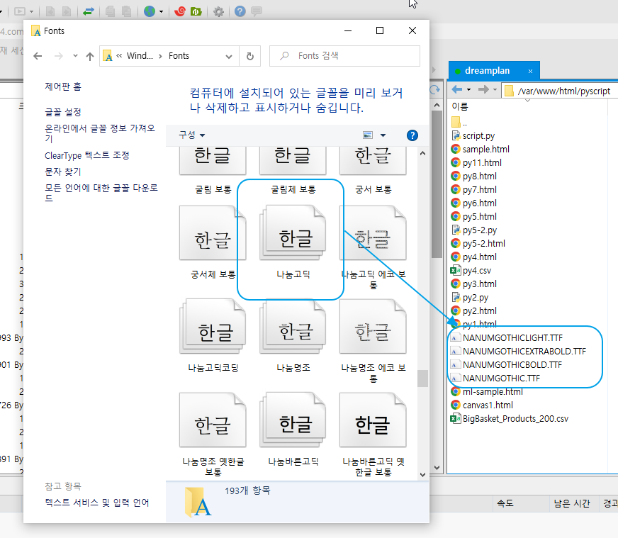 홈페이지에 접속하는 FTP 창을 열어 원하는 폰트를 드래그하시면 폰트가 업로드될텐데요.