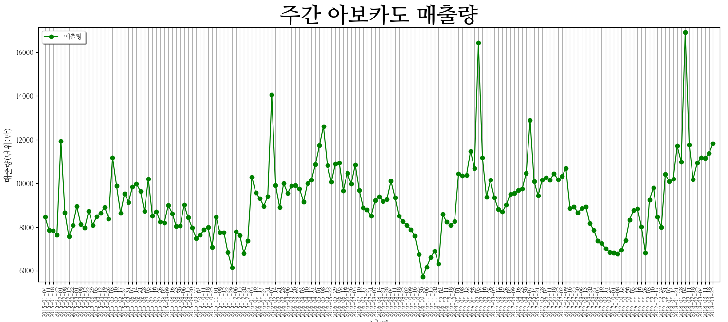 plt.ylabel('매출량(단위:만)', fontsize=12)