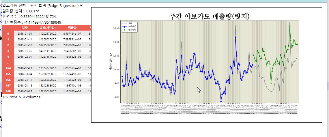 릿지 알고리즘일 때는 릿지 모델을 정의해 훈련을 하고,