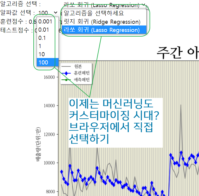 각각 알고리즘 종류를 선택하는 선택 상자와, 알고리즘의 과적합을 방지할 알파값을 선택하는 선택 상자입니다.