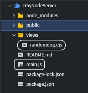 프로젝트 탐색창에서 기본 main.js 파일 수정과 신규 파일 views/randomdog.ejs 파일을 추가했습니다.