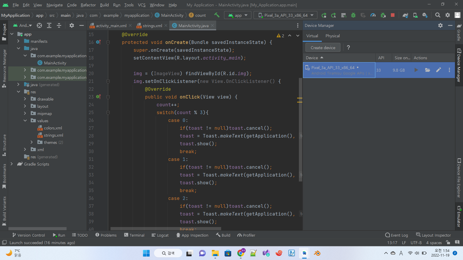 안드로이드 로봇 이미지를 클릭하면 토스트 메시지를 바꿔가면서 보여주는