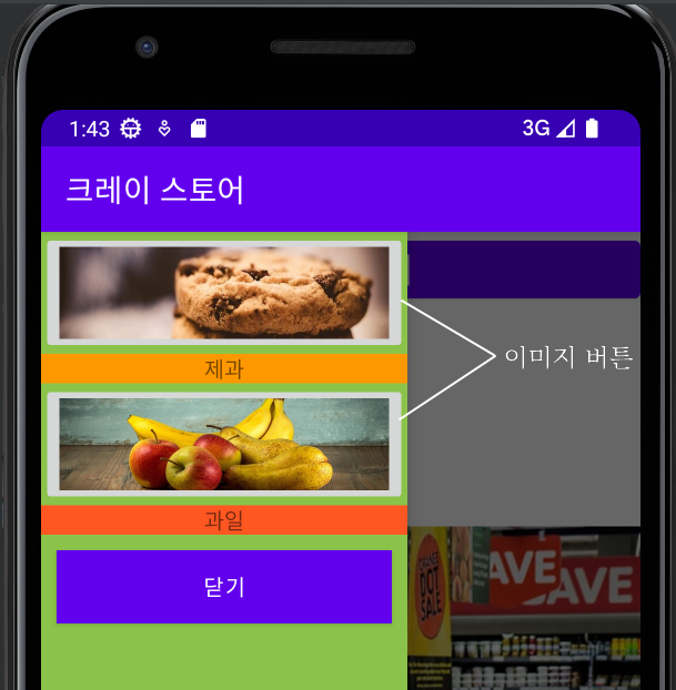 첫 번째 버튼을 클릭하면 과자류 메뉴판으로,