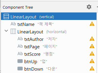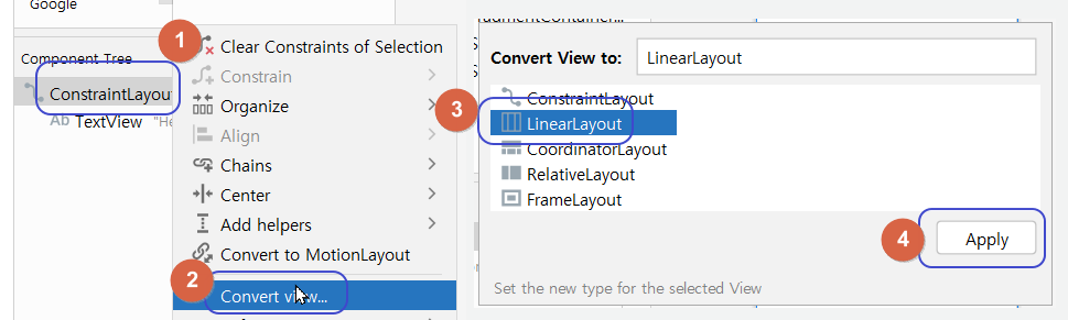 Component Tree 창에서 1) ConstraintLayout 우클릭 - 2) Convert view - 3) LinearLayout - 4) Apply