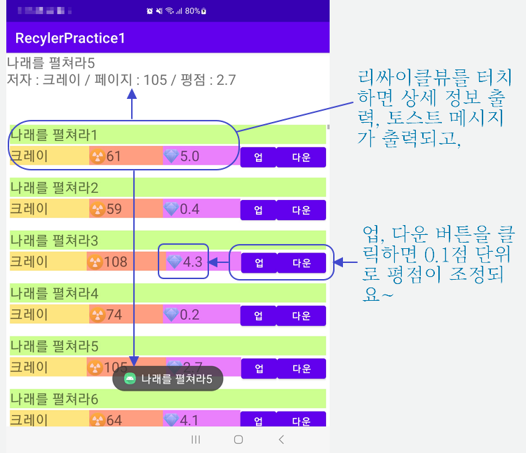 책을 한권 선택하면 토스트메시지와 함께 책 정보를 메인 액티비티에 표시해주는데요.