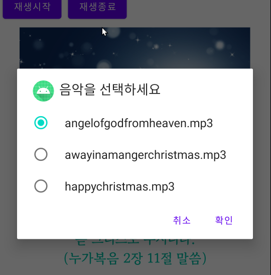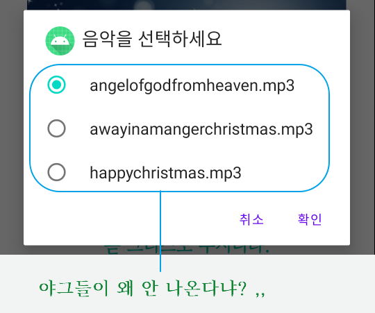 // ad.setMessage("음악을 선택하세요."); <-- ad.setSingleChoiceItems 외 동시 사용 불가