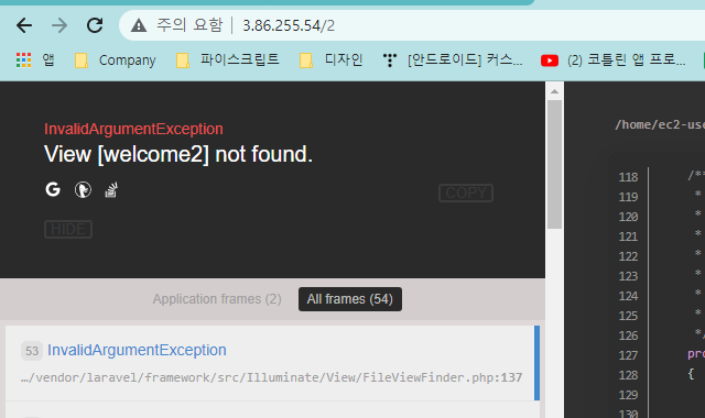 위 내용은 http://3.86.255.54/2 페이지에 접속하면 welcome2 뷰를 보여주시오! 라는 설정인데요.