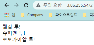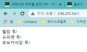 http://3.86.255.54/2 웹페이지를 호출하니, 아래와 같은 결과가 나왔습니다.