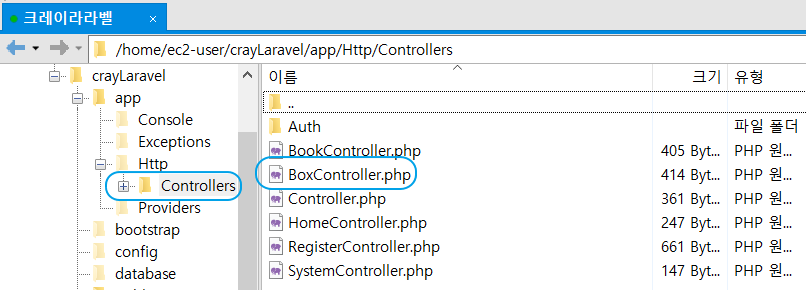 /home/ec2-user/crayLaravel/app/Http/Controllers ( 컨트롤러가 들어 있는 폴더 )