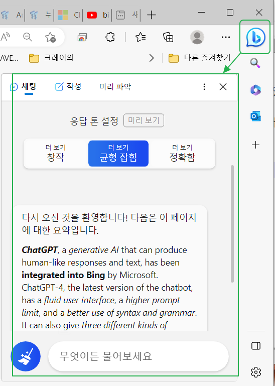 먼저 에지 브라우저를 켠 다음 우측의 빙 아이콘을 클릭하면 빙 채팅 창이 오른쪽이 짜짠-! 하고 펼쳐지는데요.