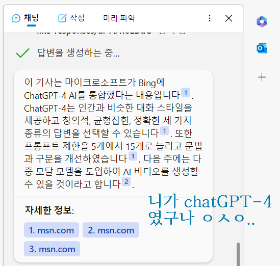 왔다 갔다 해서 영 못 믿겠지만 빙에서는 확실히 chatGPT4 이기 때문에
