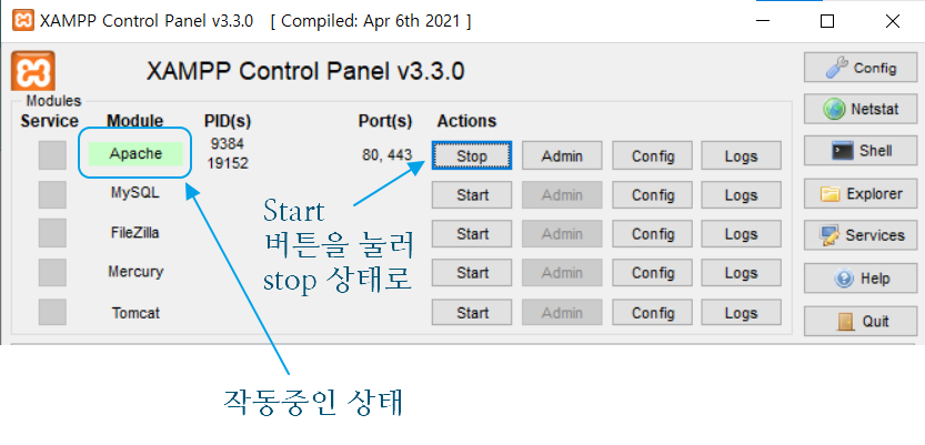 XAMPP 컨트롤 패널 창을 열어 ( 지난 게시글에 패널 창을 여는 방법이 기록되어 있습니다. )
