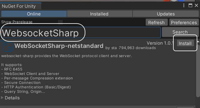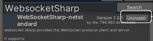 WebSocketSharp-netstandard ( 닷넷용 웹소켓 ) 오른쪽 install(설치) 버튼을 눌러주시면 됩니다.